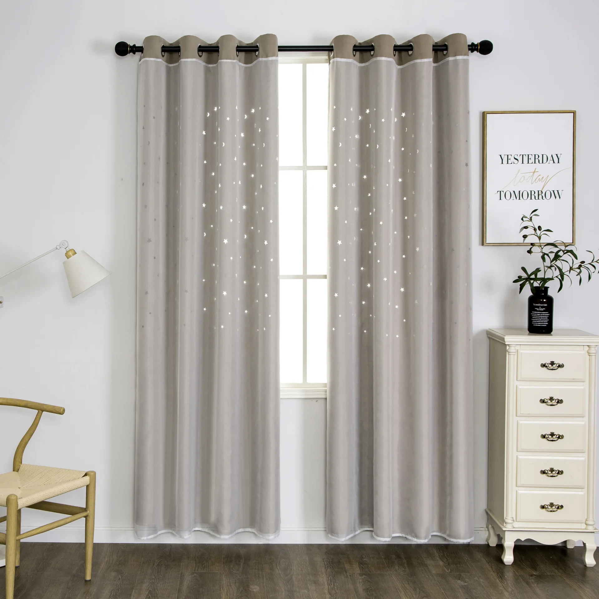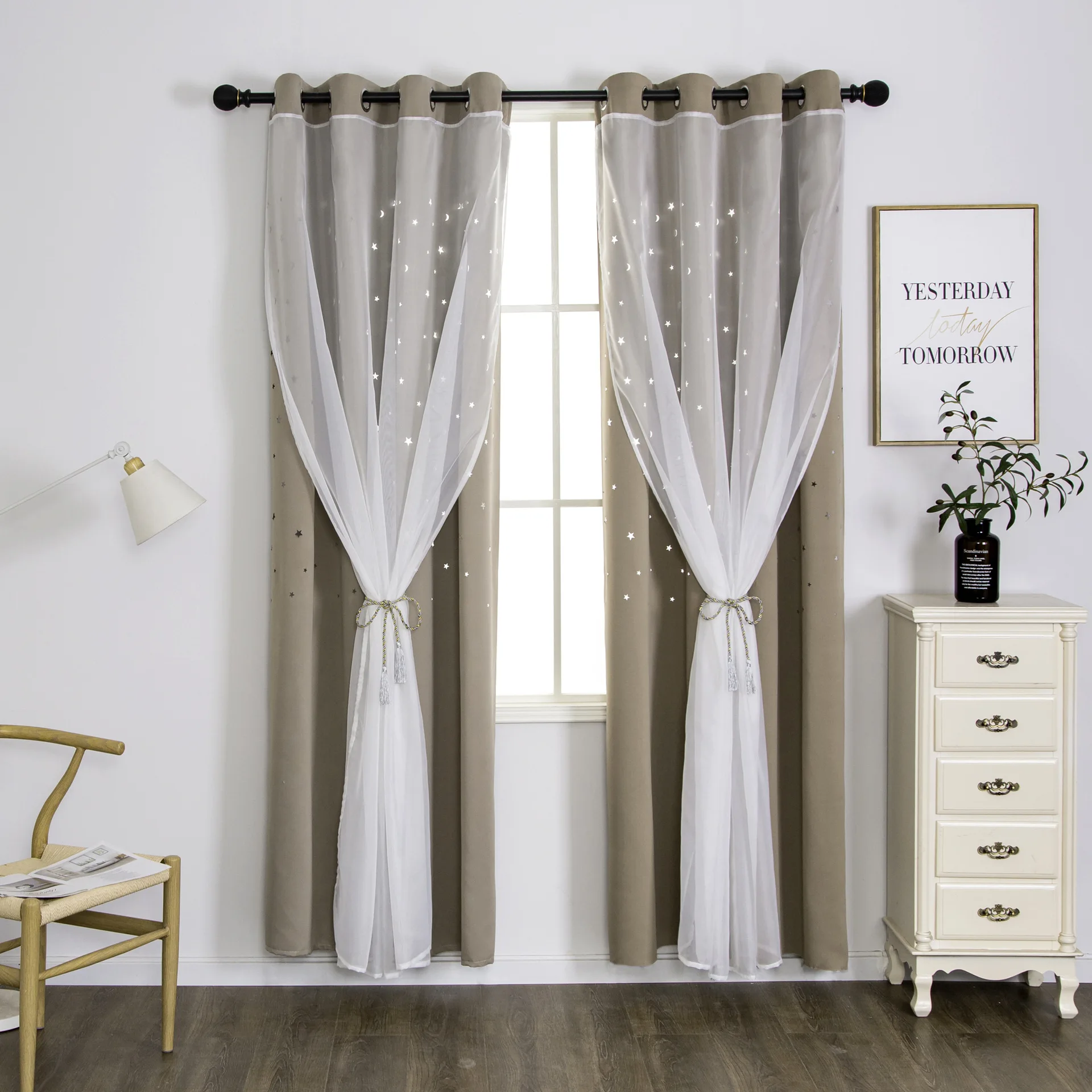 Amazon Tulle Hollow Star Double-layer Blackout Curtain ,European-style creative beige decorative blackout curtains/